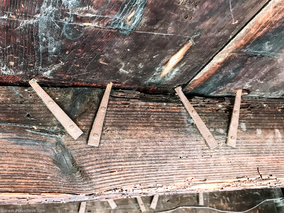 On the side of the building we had the opportunity to look under one of the floor slabs and take a closer look at one particular technical detail. When visiting the rooms in the palace, we were accompanied by a constant squeak of wooden floor panels, which sounded like the chirping of birds. This noise is the reason why those floors are called Uguisu Bari – nightingale floors.