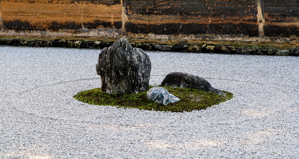 Ryoanji temple is one of the largest schools of Rinzai-Zen. It is mainly visited for its Zen garden (kare sansui), which is one of the most famous of its kind. The garden consists only of stones in various sizes – no water, no plants. Lost in the symbolic infinity of the sea of white pebbles, it is adorned by a total of fifteen little islands of basalt stones.