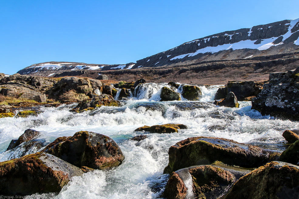 We crossed the water of the fjord on a little dam just before its end. Behind it, the street took us back along the shore towards a little village which consisted of only a few houses. That’s where we finally turned left to climb yet another mountain. From now on, the street was different. It was one of those mostly unpaved streets in Iceland, of which I had read so much before our trip. It went uphill in steep serpentines, and at the edge of the narrow road snow walls, which had been gashed by heavy equipment, were still piling up. Now we understood why these streets were impassable in winter.