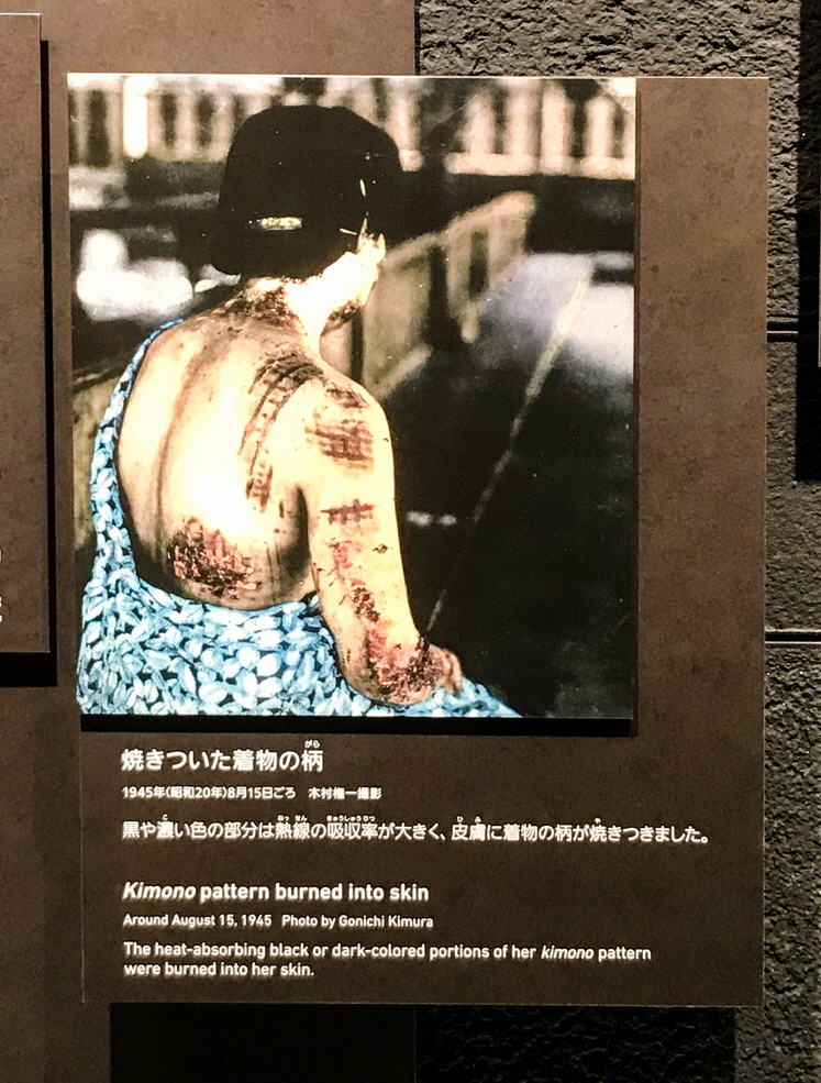 Dieses im Vergleich harmlose Foto zeigte z. B., dass sich selbst in mehreren Kilometern Entfernung bei Menschen das Muster ihrer Kleidung, hier ein Kimono, durch die Schockwelle in die Haut gebrannt hatte.