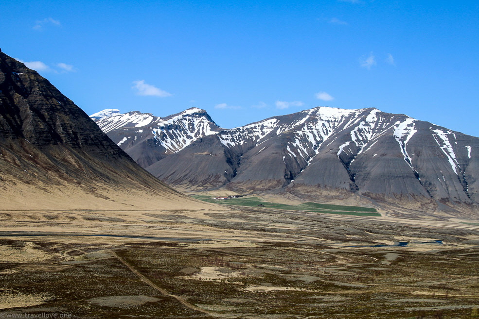 Das Wasser des Fjords überquerten wir kurz vor seinem Ende über einen kleinen Damm. Dahinter führte uns die Straße wieder ein Stück am Fjordufer zurück, bis wir schließlich in einem kleinen Ort, der nur aus ein paar wenigen Häuschen bestand, links abbogen, um den nächsten Berg zu erklimmen. Ab hier war Straße jedoch anders. Es war eine der zum größten Teil ungeteerten Straßen Islands, von denen ich vorher so viel gelesen hatte. Sie ging serpentinenartig steil bergauf und am Rand der schmalen Fahrbahn türmten sich noch immer Schneewände auf, in die man mit schwerem Gerät eingeschnitten hatte. Wir konnten uns nun gut vorstellen, warum diese Straßen im Winter unpassierbar waren.