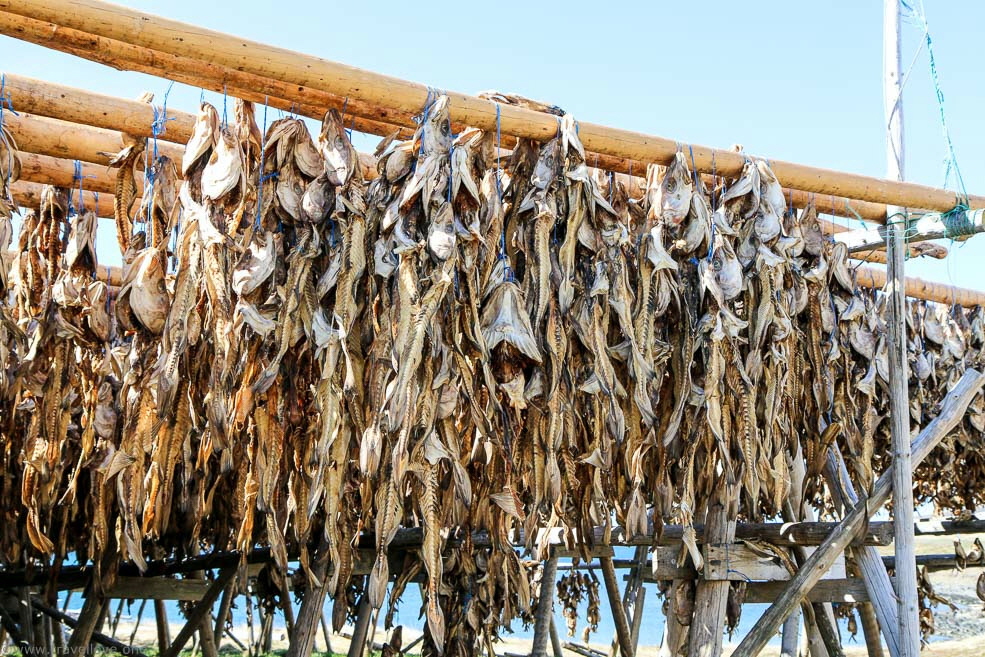 Im Reiseführer hatten wir gelesen, es würde sich lohnen, das kleine Fischerdorf Flateyri entlang der Strecke zu besuchen, also bogen wir an einem Wegweiser dorthin ab. Nach ein paar Kilometern entlang des Fjords kamen wir an Holzgestellen mit Harðfiskur vorbei – Trockenfisch, einer der beliebtesten Snacks in Island. Sehr gesund und voller Vitamine und Omega-3-Fettsäuren – allerdings auch recht unappetitlich anzusehen.
