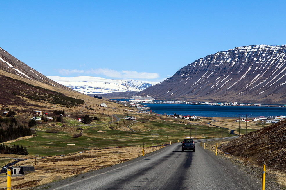 Wie in Akureyri, ging ich schon einmal von Bord, um den Mietwagen, den wir auch hier bei Europcar/Holdur gebucht hatten, zu übernehmen. Auch hier gestaltete sich die Anmietung extrem komfortabel. Keine 10 m neben dem Steg stand ein Auto mit der Aufschrift Europcar. Durch das Fenster hindurch reichte mir eine freundliche junge Dame die Unterlagen und nahm meine Kreditkartendaten auf. Die einzige Verzögerung die es bei der Übergabe gab, wurde durch einen Mieter vor mir verursacht. Ein kurzer warnender Schrei eines Hafenmitarbeiters, ein lautes kratzendes Geräusch und ein paar Menschen, die aufgeregt angelaufen kamen. Die Mietwagen waren rückwärts zu den Wellenbrechern der Mole geparkt. Der Mieter konnte wohl mit einer manuellen Schaltung nicht umgehen und hatte die Kupplung getreten, ohne die Handbremse angezogen zu haben. Rückwärts war er über das Ende des Parkplatzes und in die großen Steine der Wellenbrecher gerollt. Diese hatten zwar eine unfreiwillige Wagenwäsche verhindert, aber das Auto saß dort erst einmal fest.
