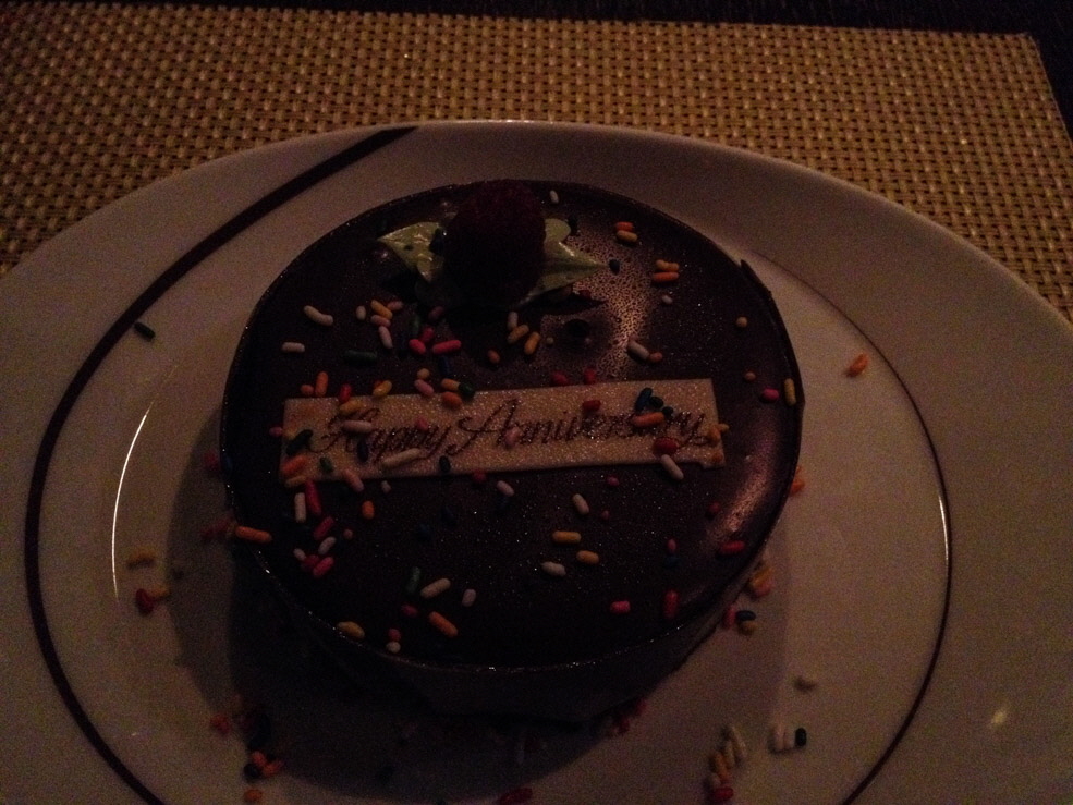 Bereits am Einschiffungstag hatten wir für den 10.10. einen Tisch im Tuscan Grille reserviert, da uns das Restaurant noch von der Constellation in guter Erinnerung war. Ein wenig bereuten wir jedoch, dass wir die Reservierung so früh getätigt hatten. Denn wie bereits erwähnt, wurden die Specialty-Restaurants an Bord nun ständig mit 50 % Nachlass beworben. Aber egal, wir wollten das Essen einfach nur genießen und taten dies auch. Essen und Service waren wiederum hervorragend. Nachdem wir durch leckere Vorspeisen, Steaks und himmlische Desserts schon fast platzten, kam die Bedienung noch mit einer Überraschung für unseren Hochzeitstag an den Tisch. Sehr lieb!