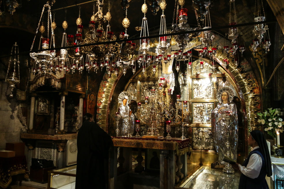 Der Gang führt unter die große Kuppel der Kirche, die das Heilige Grab überspannt. Das Grab ist von einer 300 Jahre alten Struktur aus Holz und Stein überbaut (Ädikula). Der Überlieferung nach soll sich hier die Höhle befunden haben, in der Jesus beigesetzt wurde.