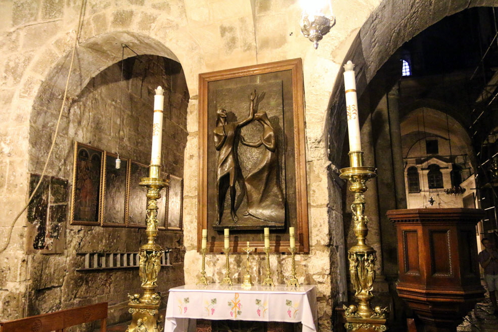 Ein Stück weiter auf der Via Dolorosa kommt man an Station III. An dieser Stelle soll Jesus unter dem Kreuz zusammengebrochen sein. Hier steht eine kleine Kapelle, die davon kündet. Die Kapelle geht fast nahtlos in die vierte Station über, wo Jesus auf Maria getroffen sein soll und wo eine weitere Kirche steht.